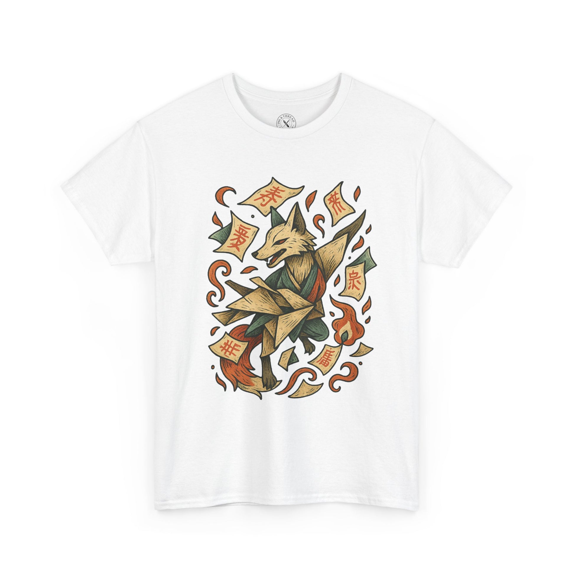 The Paper Fox springs into the world from sacred parchment — an origami kitsune mid-leap, tails twisting into fluttering charms and folded ofuda.