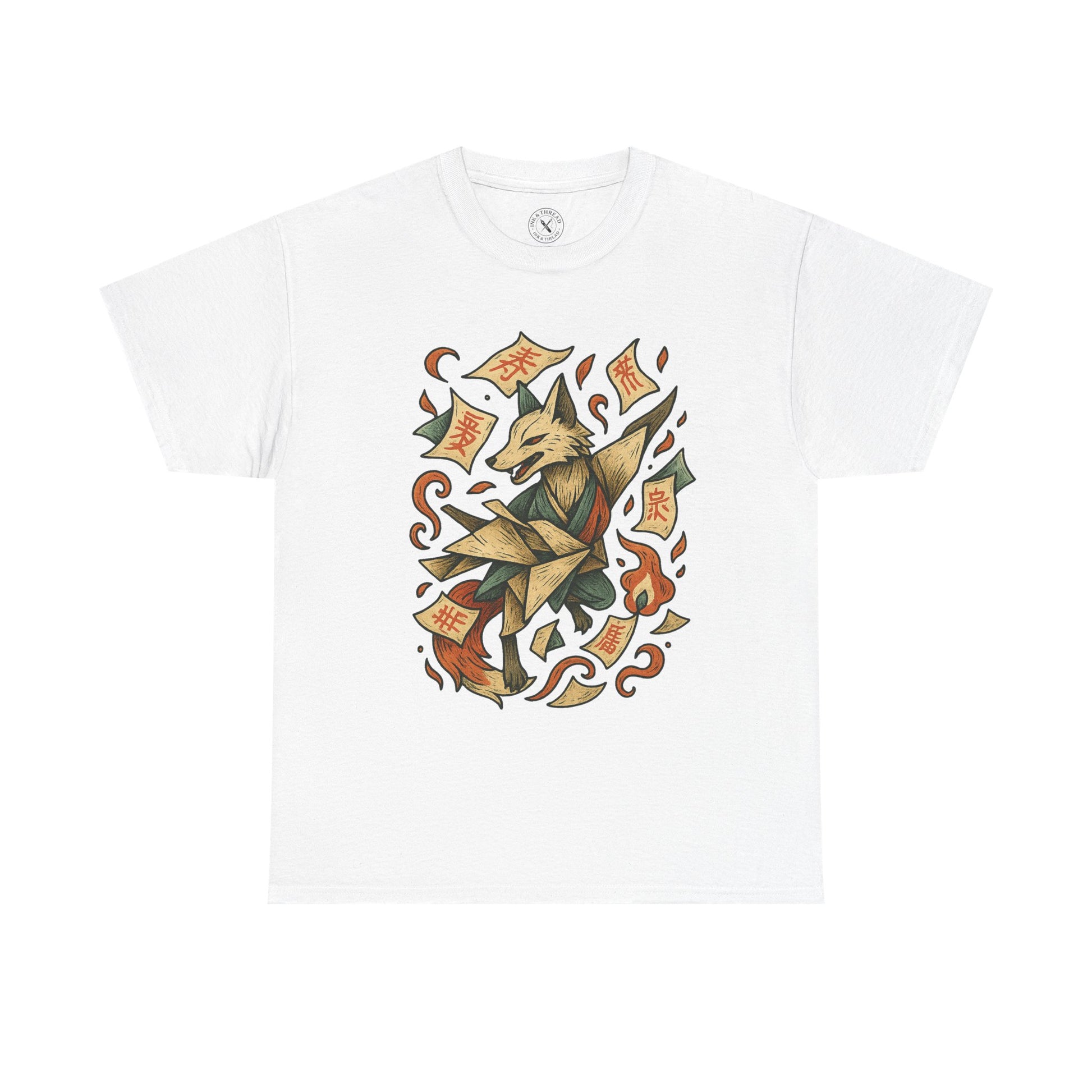 Its form is delicate yet alive, its shape shifting as it unfolds into something more spirit than animal. Around it drift paper leaves, talismans, and traces of ancient ink.