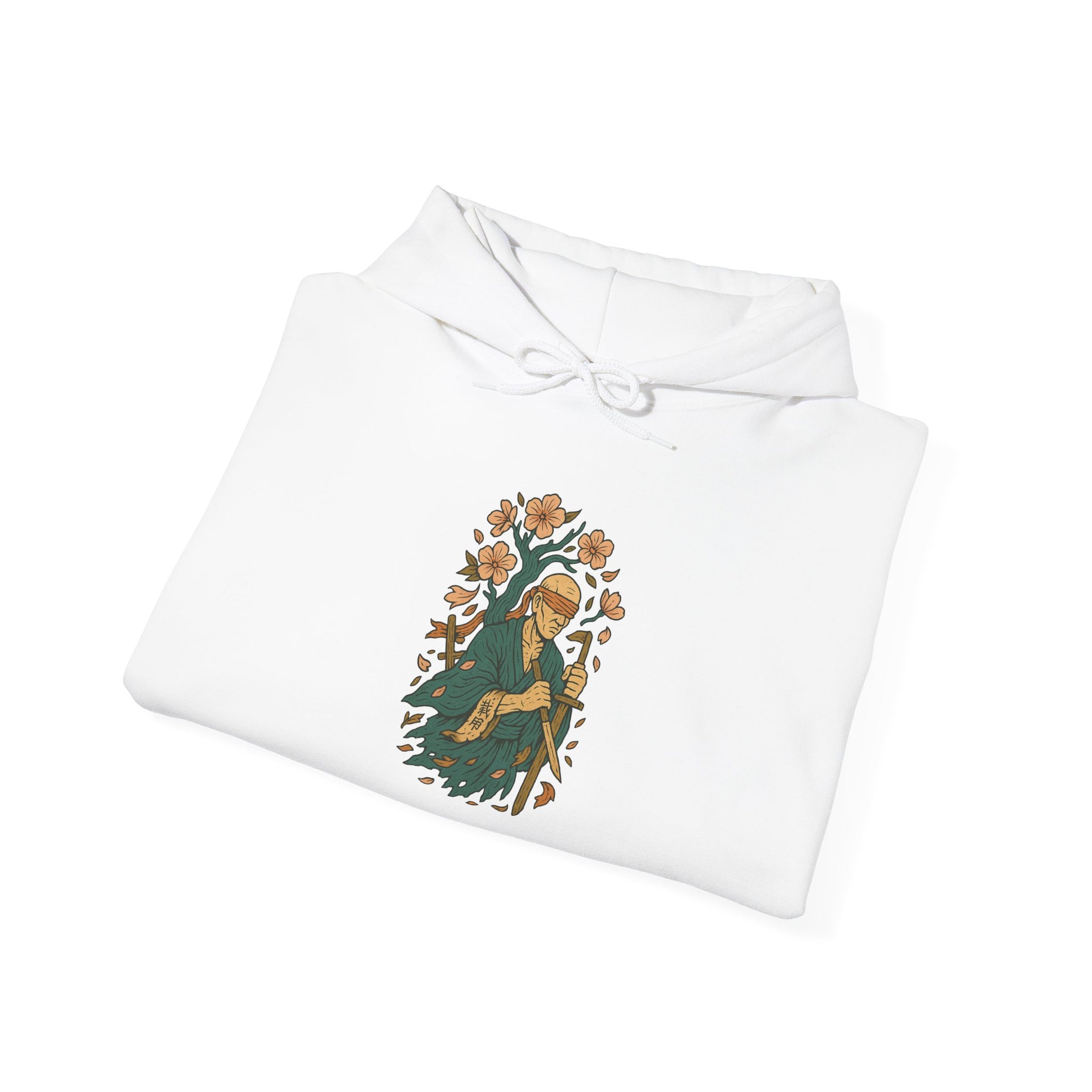 The Petal Warden stands between growth and decay — a blindfolded guardian with blossoms blooming from his shoulders and a wooden blade carved from sacred root. His stance is serene, his intent unwavering. Each petal that falls around his robes is a vow kept.