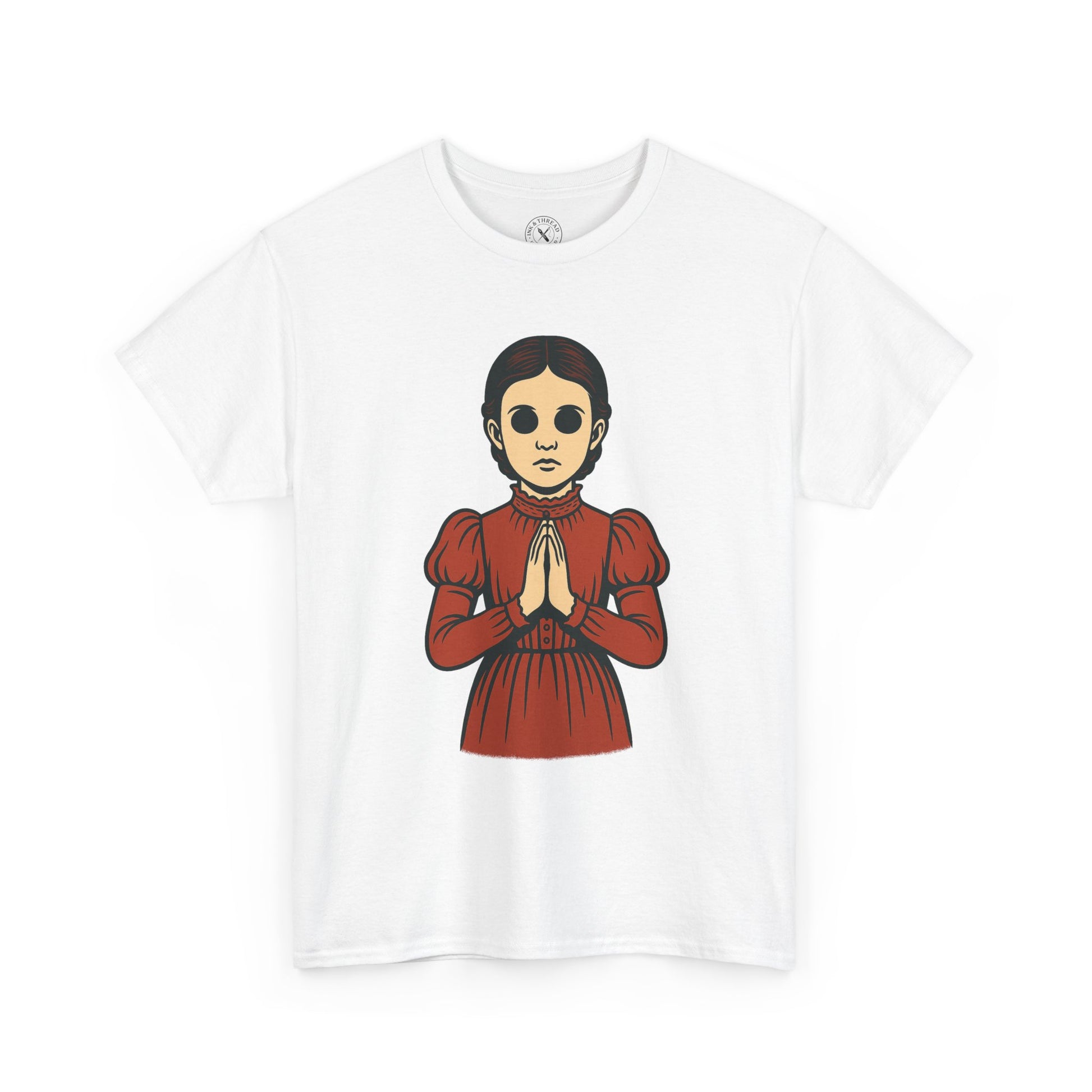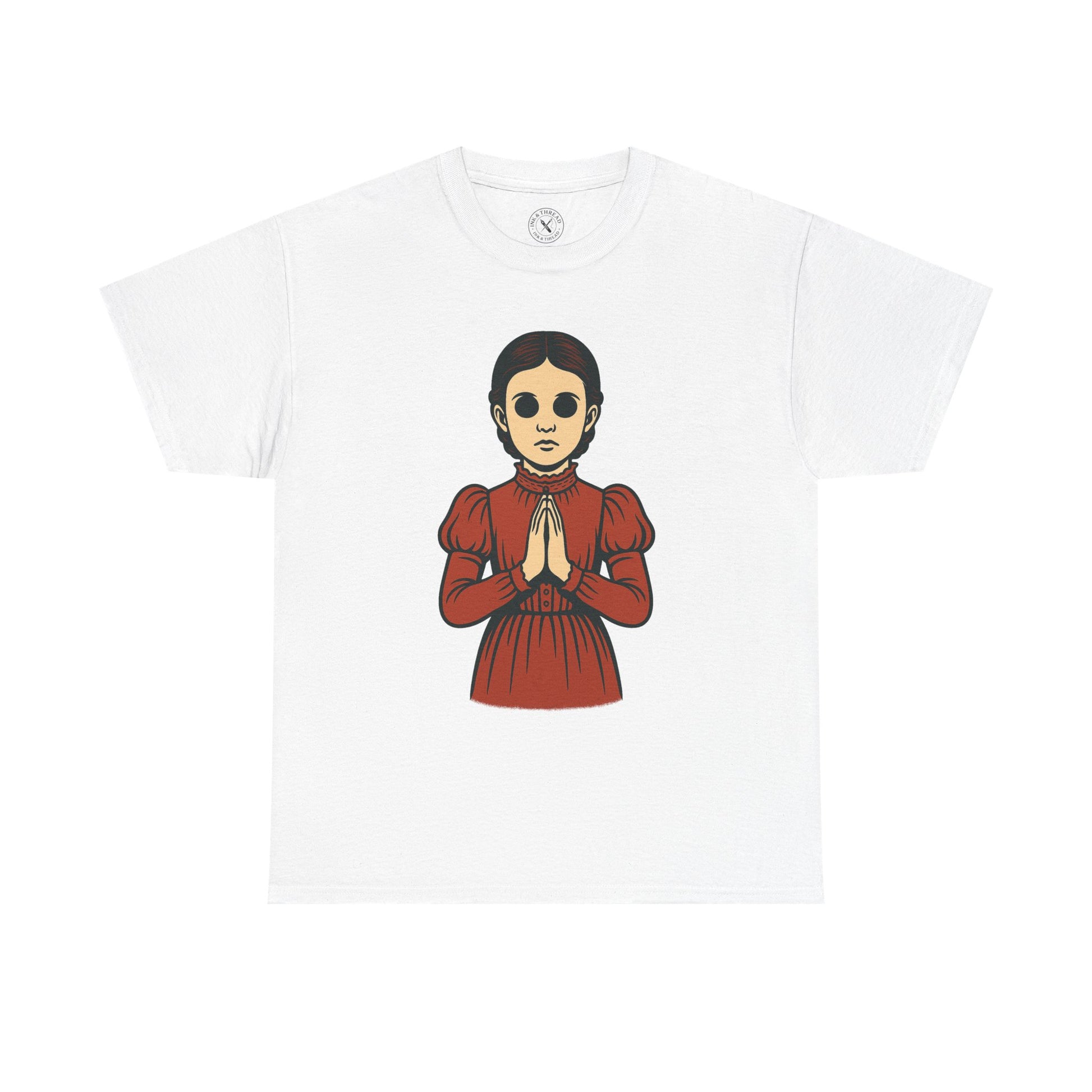A moment of silence becomes something stranger. The Prayer T-Shirt (Victorian Edition) features a surreal girl in full Victorian dress — high collar, puffed sleeves, and old-fashioned hair — hands together in prayer. Her hollow eyes turn devotion into something haunting, echoing the cryptic aura of The Hollow Ones collection.