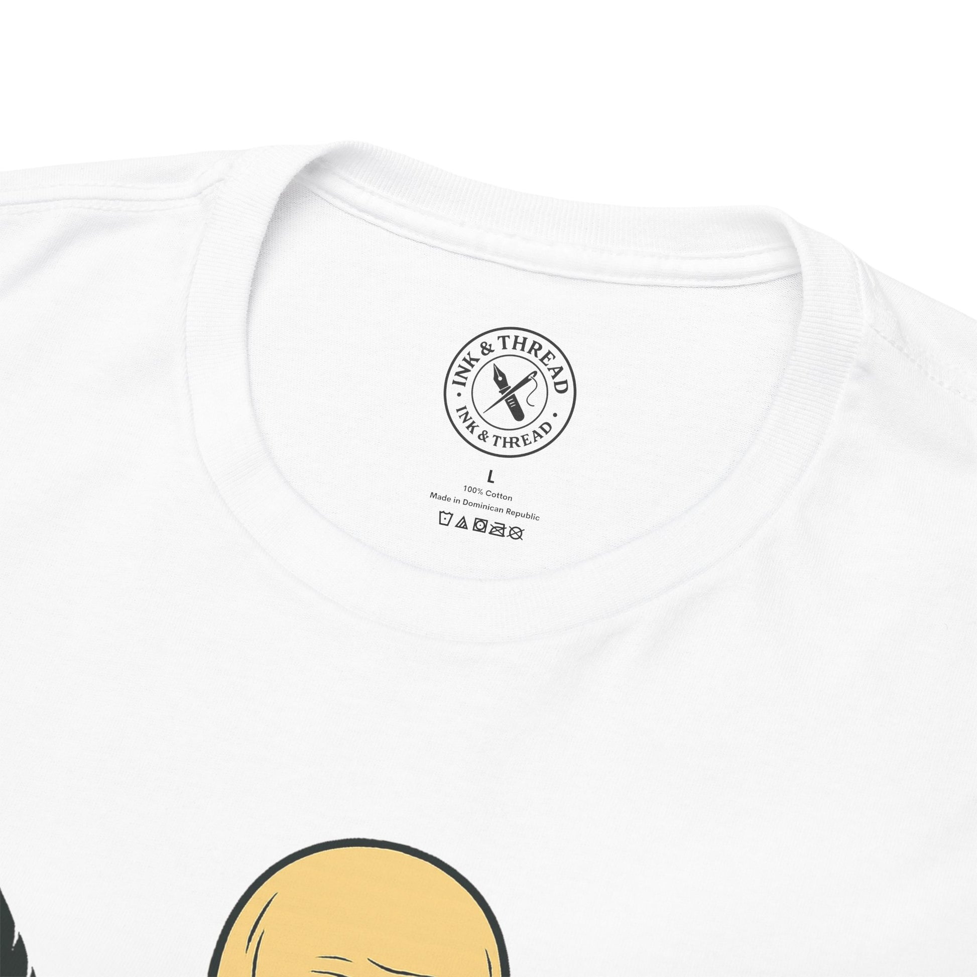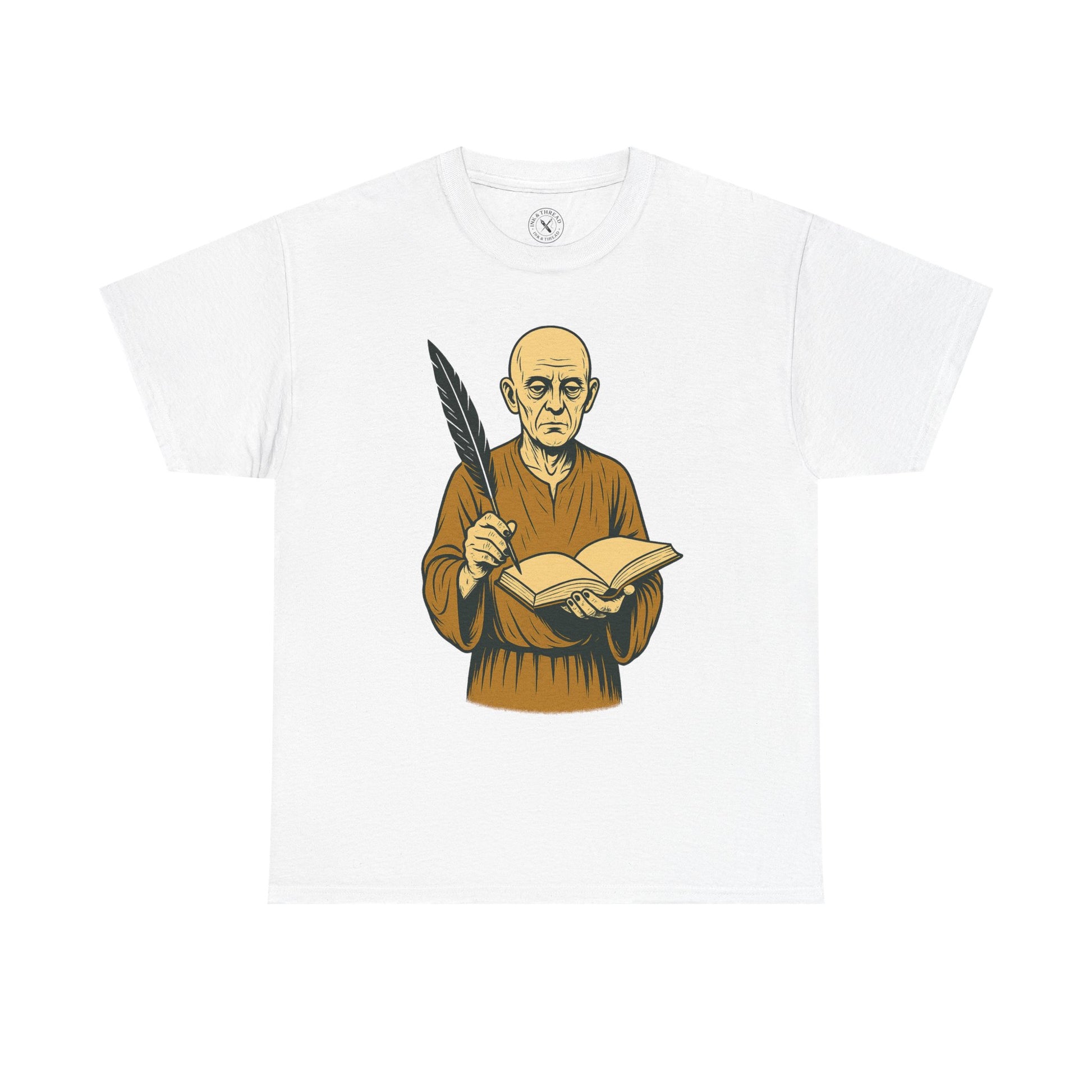 Words never written, knowledge never shared. The Scribe T-Shirt introduces a surreal bald elder dressed in an aged ochre robe, his pale hollow eyes staring into the distance. Ink-stained hands clutch a feather quill and an open book of empty pages, a cryptic symbol of silence and forgotten truths.