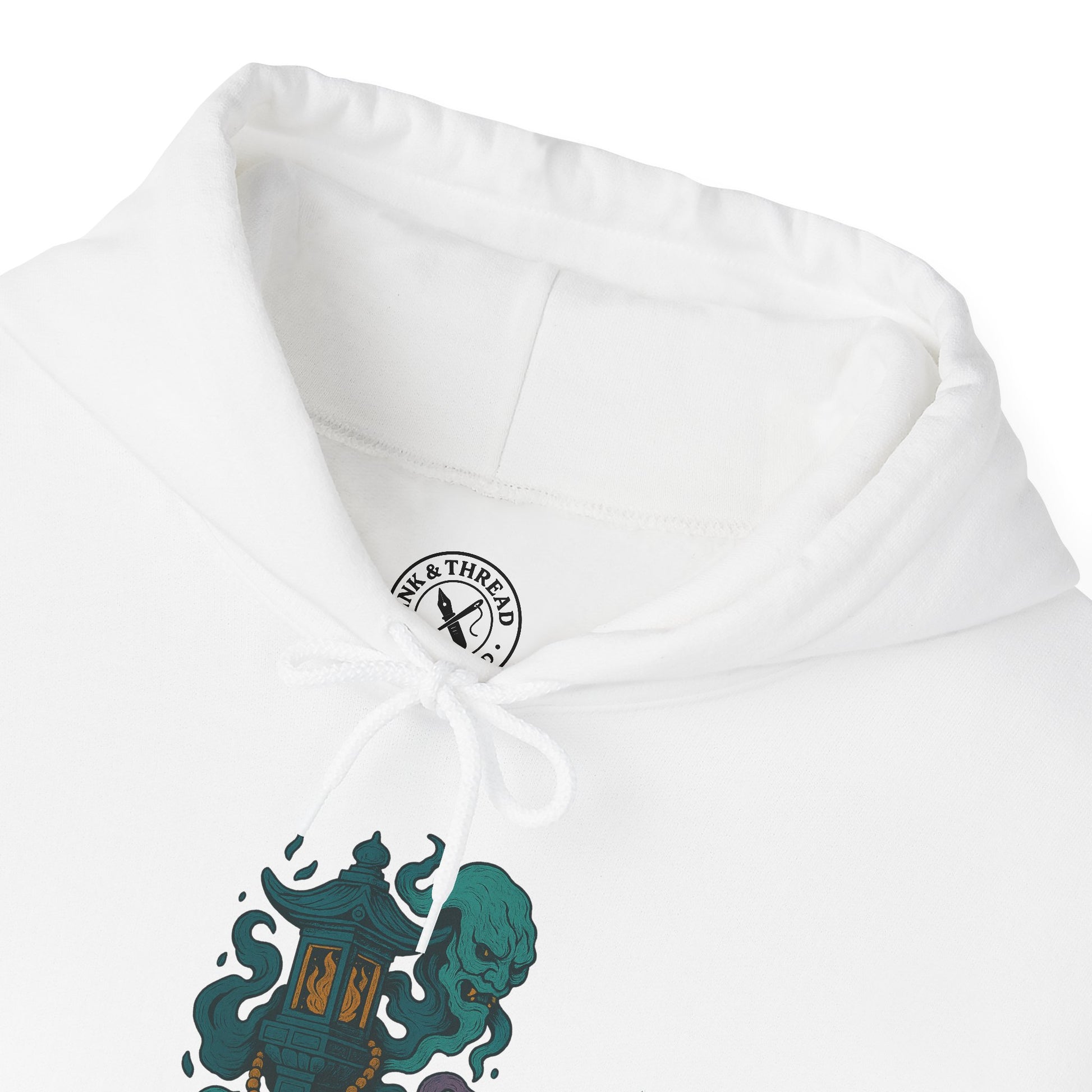 This hoodie feels like a relic — something discovered, not made. Each fold of fabric carries the calm weight of reverence and the hush of unseen eyes watching from the dark.