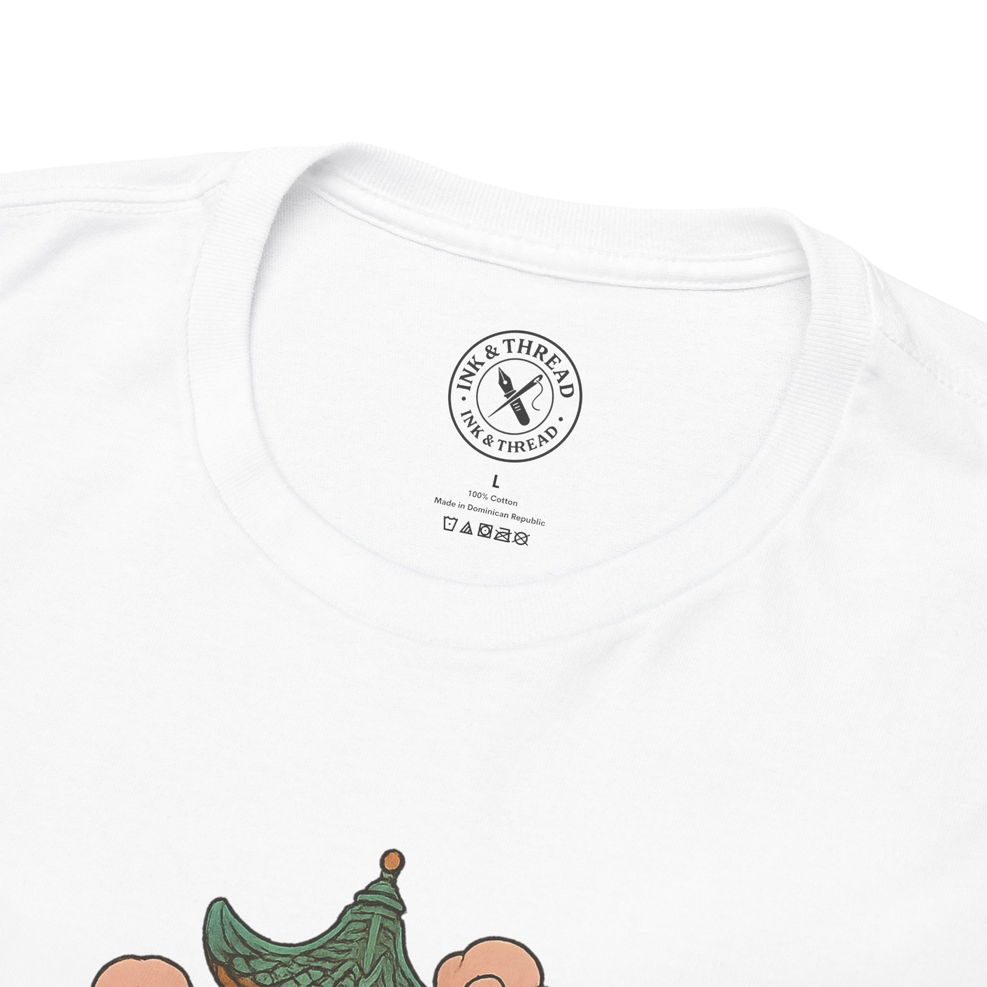 Beneath, shrine guardians and spirits bow in reverence. From the smoke spiral kanji of his final prayer, lifted toward the heavens by wind and wings.