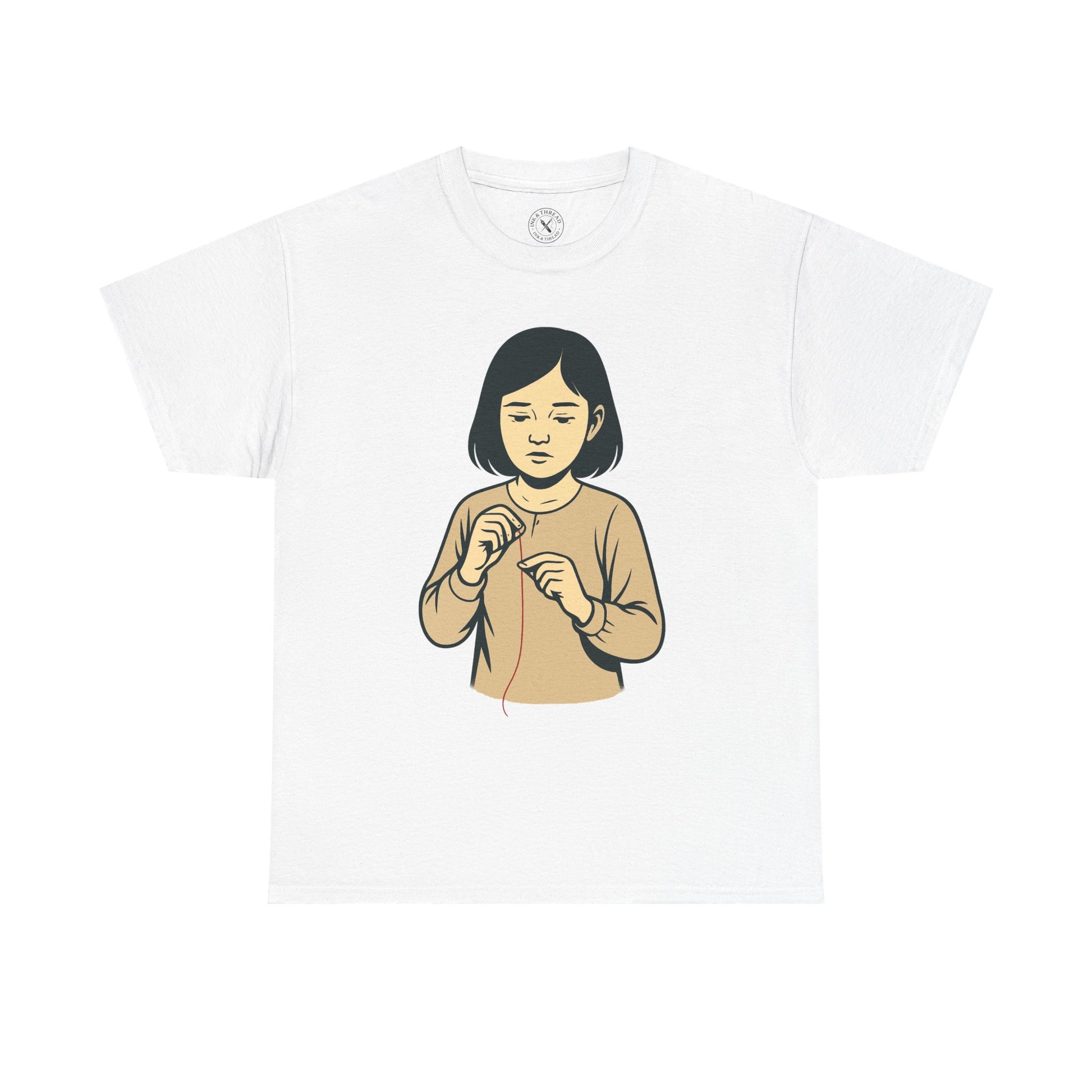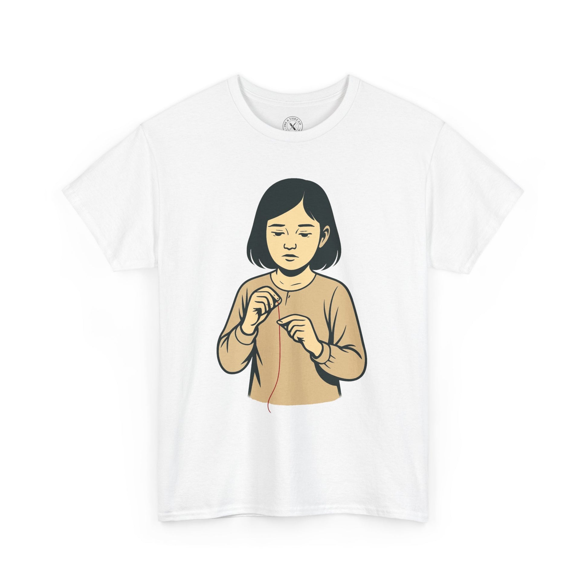 Unraveling begins in silence. The Thread T-Shirt depicts a surreal girl with softer, distinct features, staring downward as she pulls a deep red thread from her sleeve. The trailing line becomes a stark symbol of fragility, secrets, and unraveling truths — a haunting addition to The Hollow Ones collection.