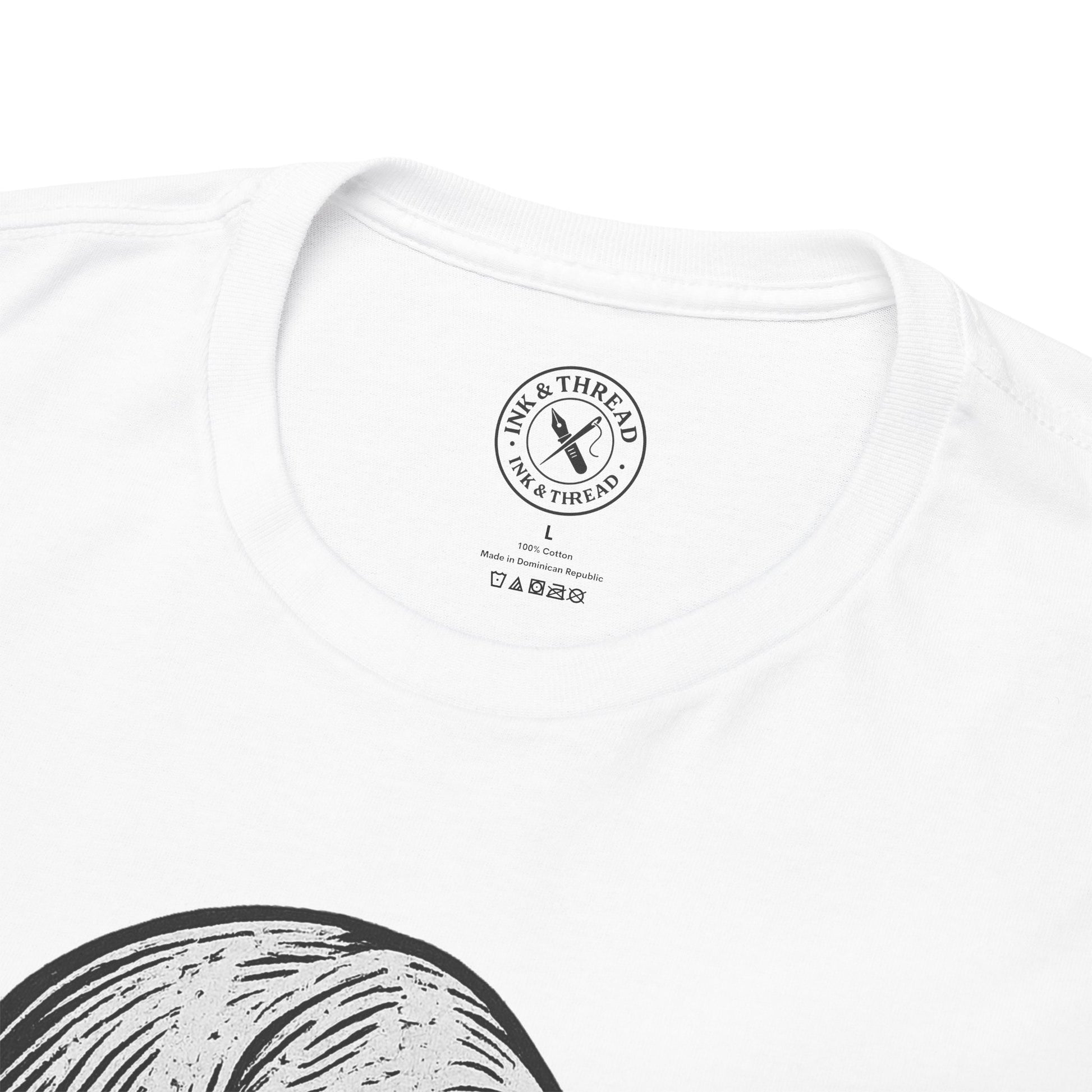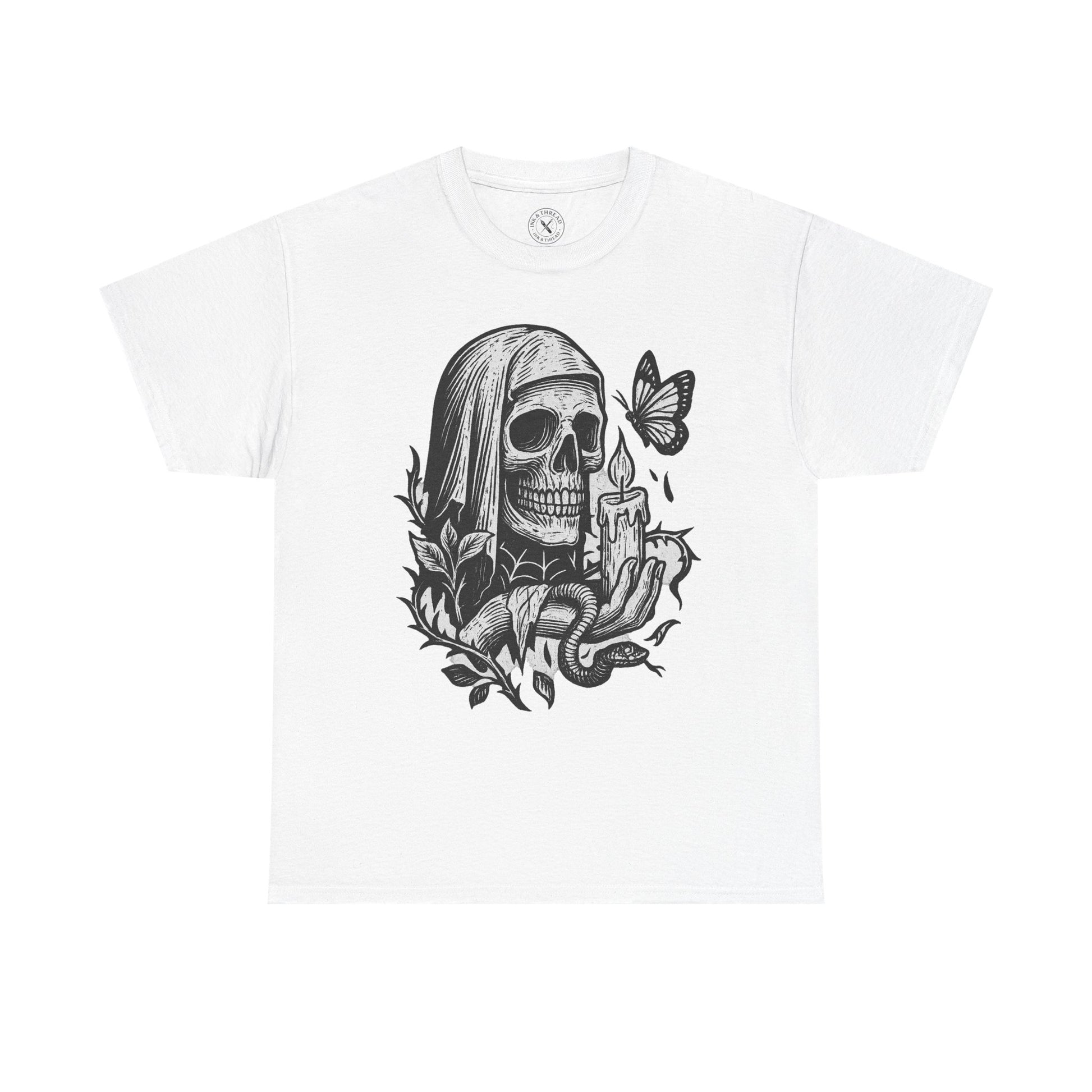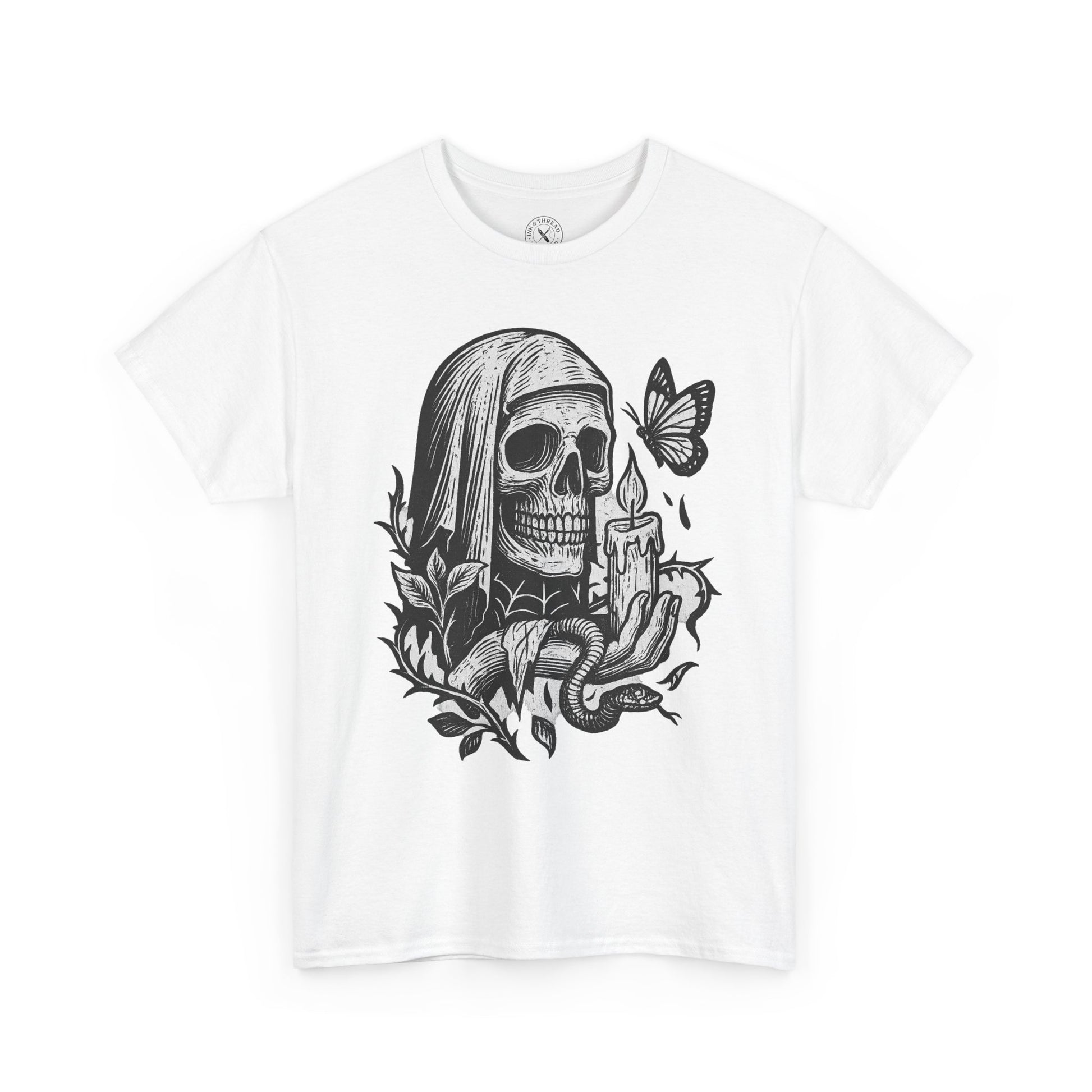The Veiled Flame is a haunting composition of contrasts — a skull shrouded in fabric, a flickering candle cradled by thorns and serpent, a butterfly in flight. It’s a design that captures the moment between decay and transcendence, hand-inked in bold vintage detail.