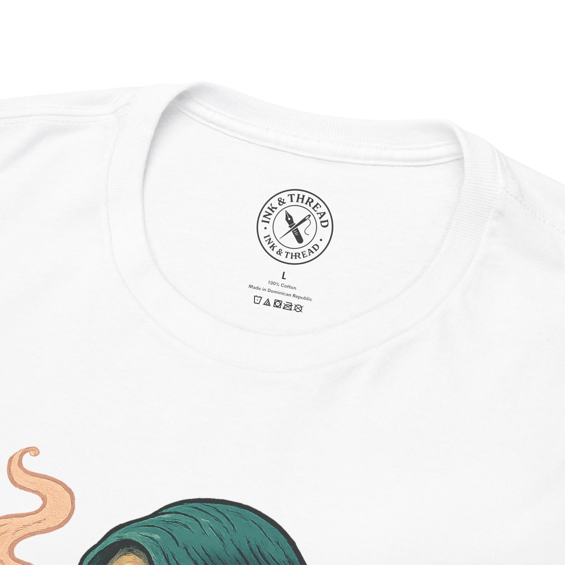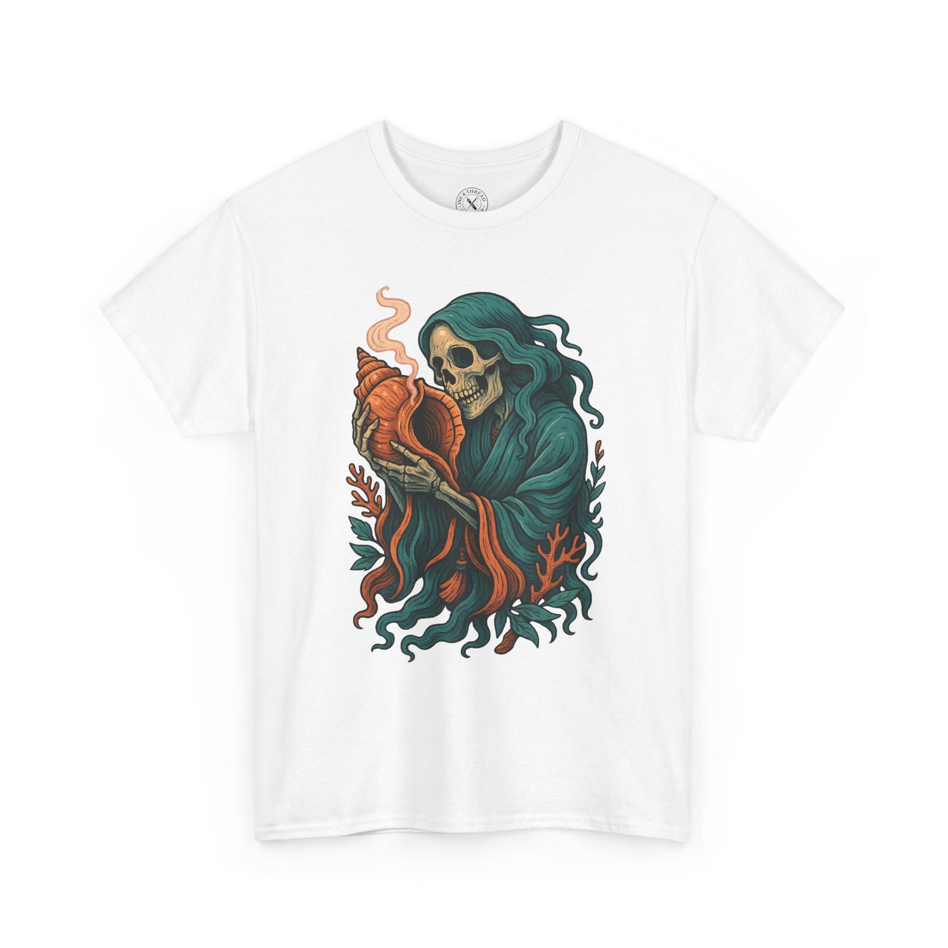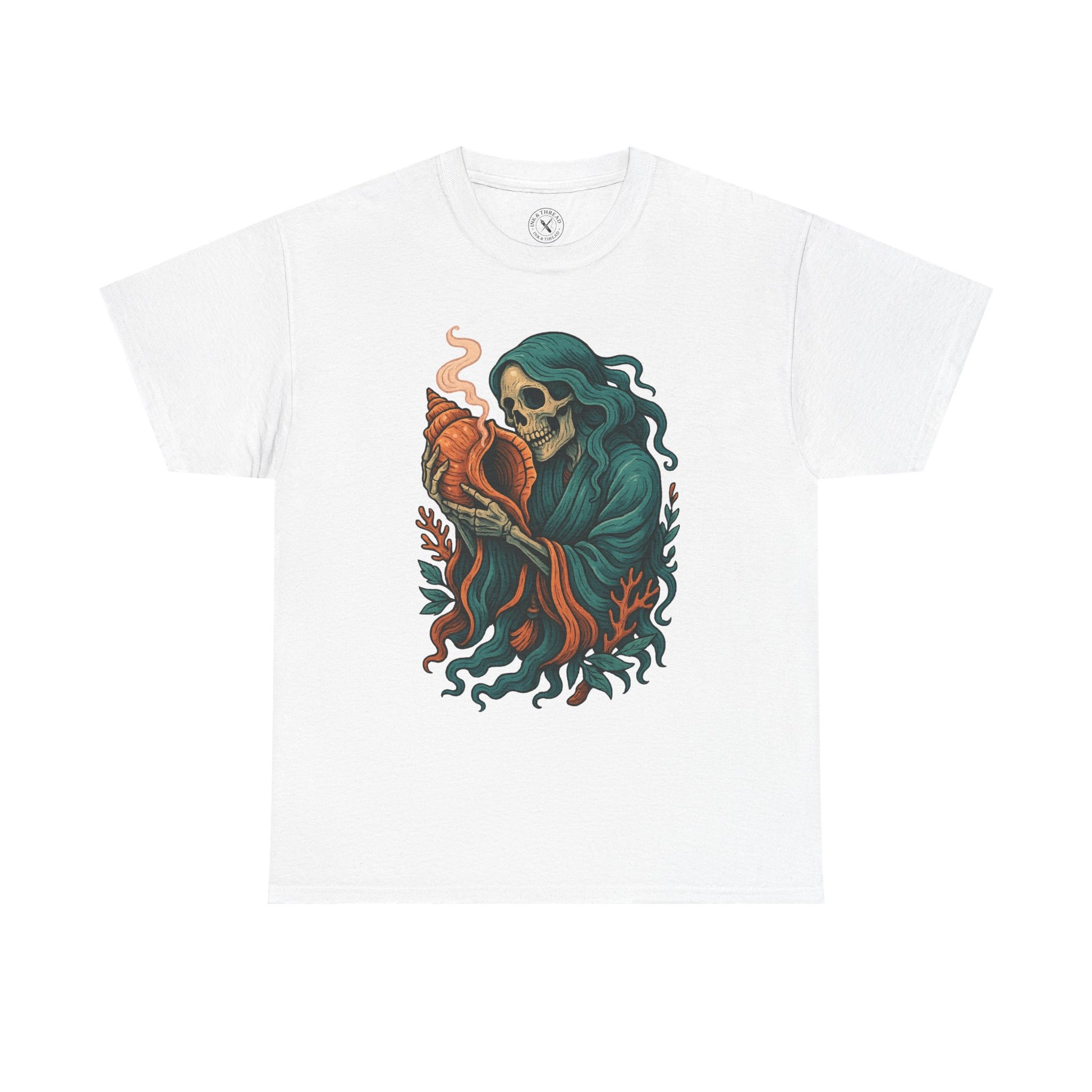 Rendered in ghostly pastel tones and swirling Japanese tattoo linework, this design embodies folklore’s oceanic dread — a relic cursed by memory and tide.