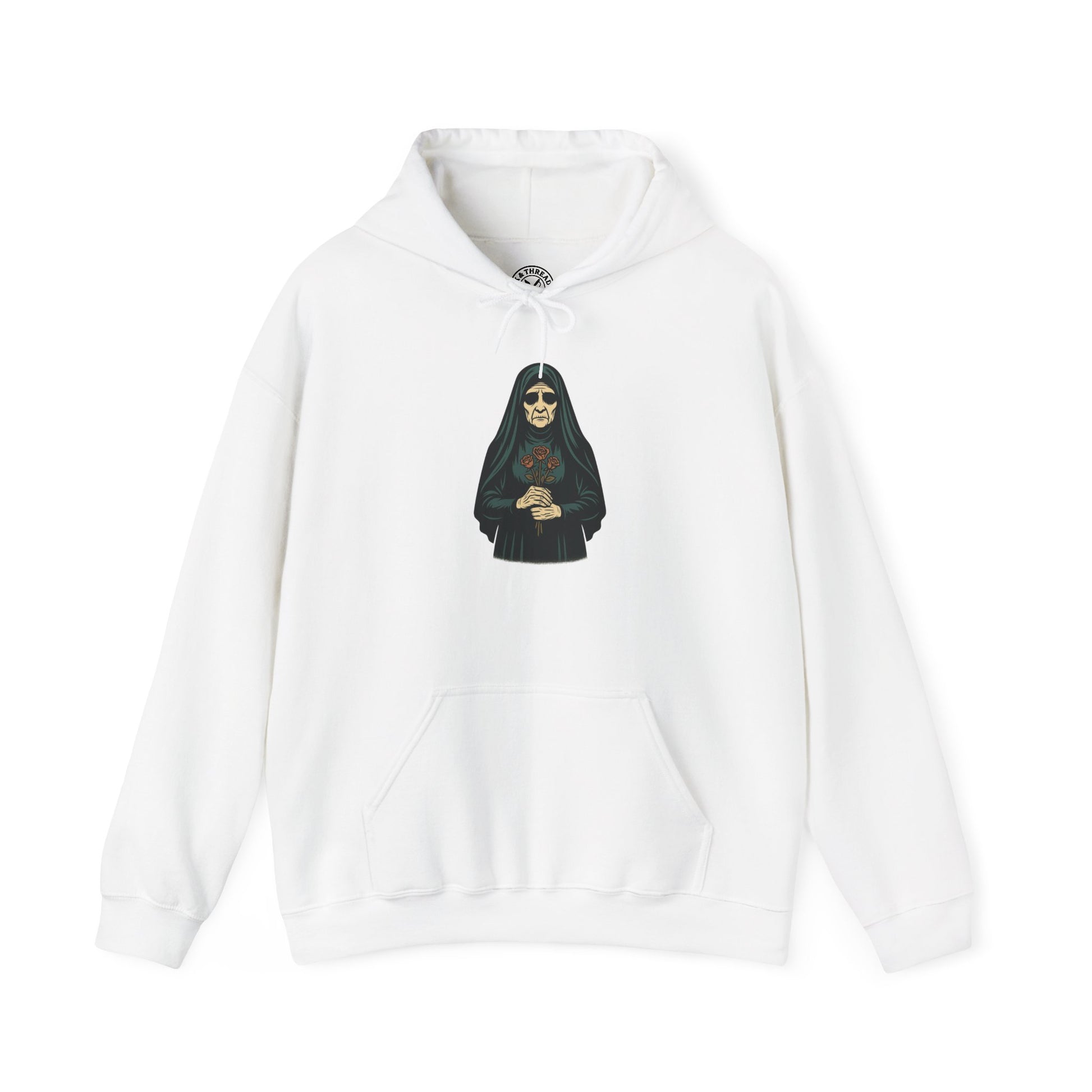 The Widow Hoodie depicts a surreal elderly woman dressed in a Victorian mourning gown and dark veil, her hollow eyes distant beneath layers of fabric. She holds a bouquet of wilted flowers — a symbol of love long dead, preserved only in ritual. Her expression, pale and unreadable, transforms sorrow into something eternal, cryptic, and haunting.