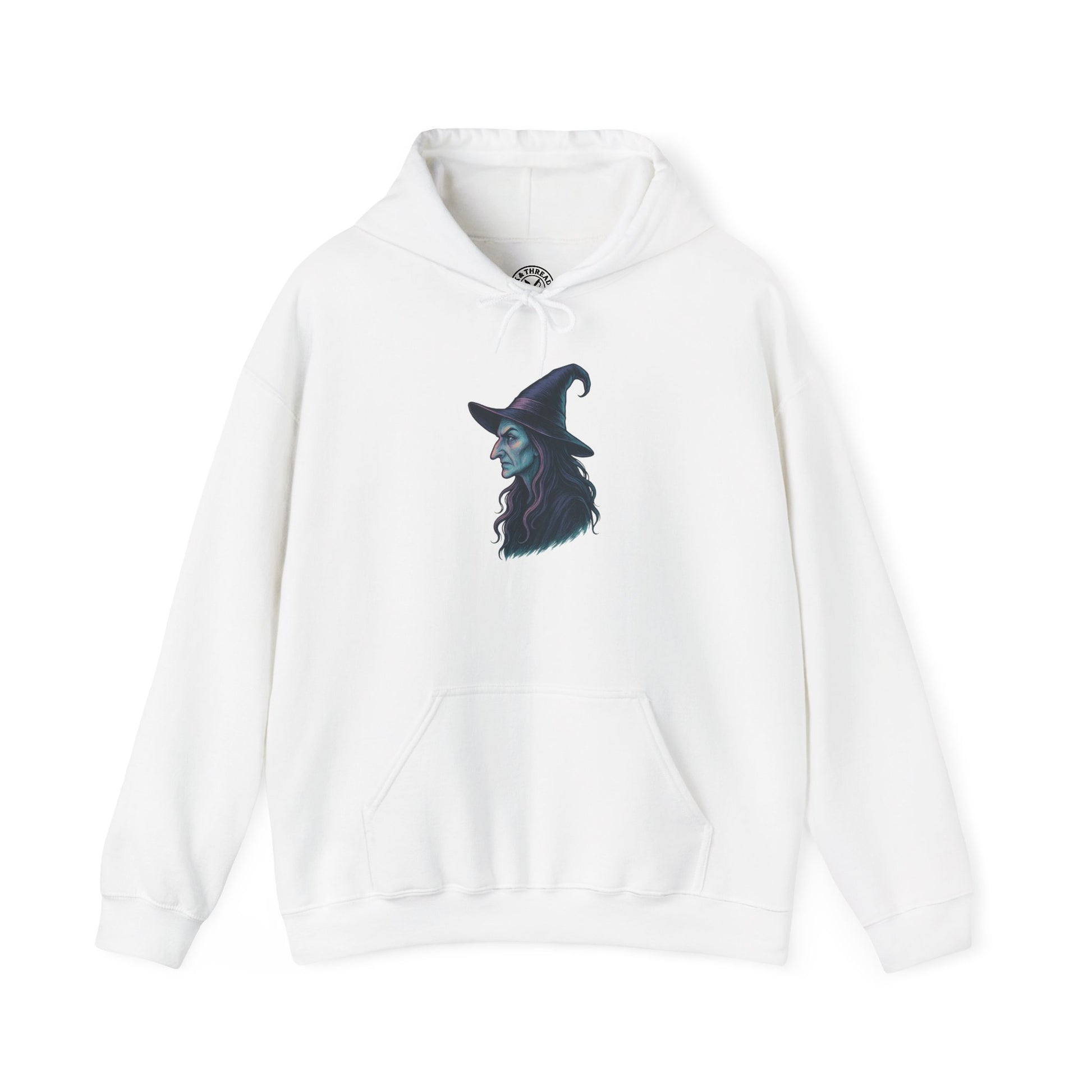 The Witch Hoodie reimagines the timeless Halloween icon through Ink & Thread’s haunting pastel lens. Her profile is sharp and regal beneath a curved hat, her eyes glimmering with secrets only the night knows. Rendered in ghostly tones of violet, teal, and midnight blue, the design channels both elegance and menace — an ode to power and the unknown.