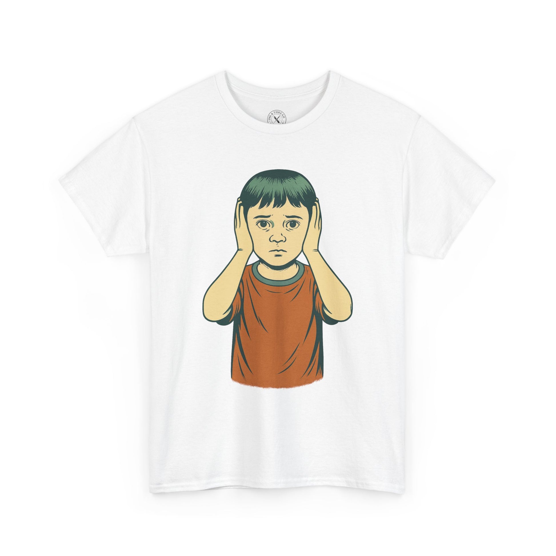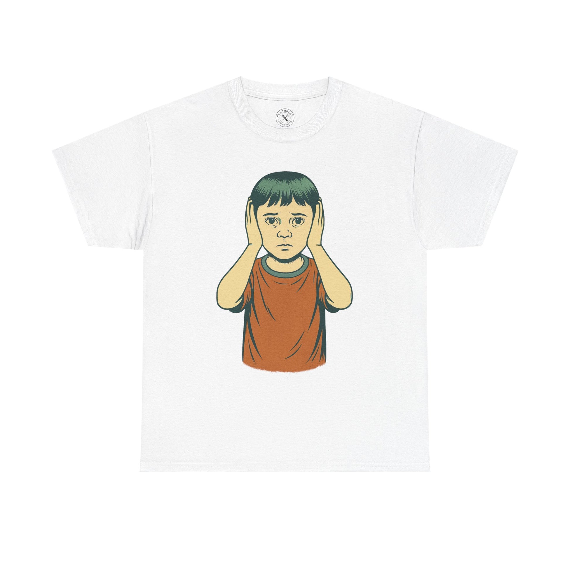 Some truths can’t be unheard. The Witness T-Shirt presents a haunting surreal portrait of a child covering their ears, staring straight ahead with anxious, knowing eyes. A design that blends innocence with unease, this piece pushes Ink & Thread’s Echoes collection into more cryptic territory.