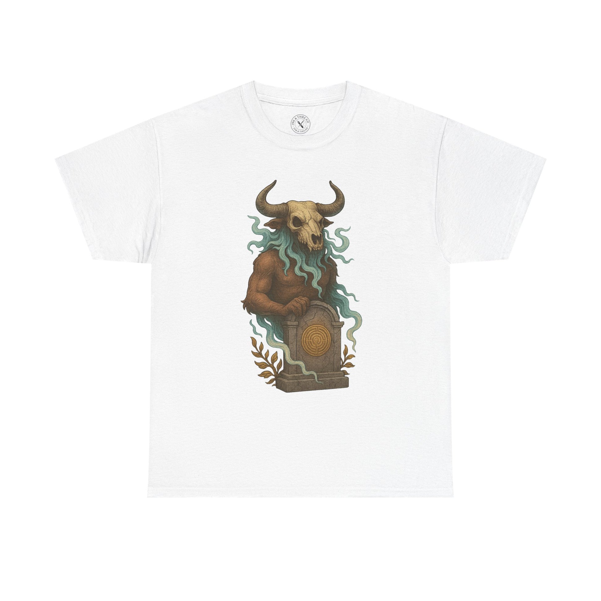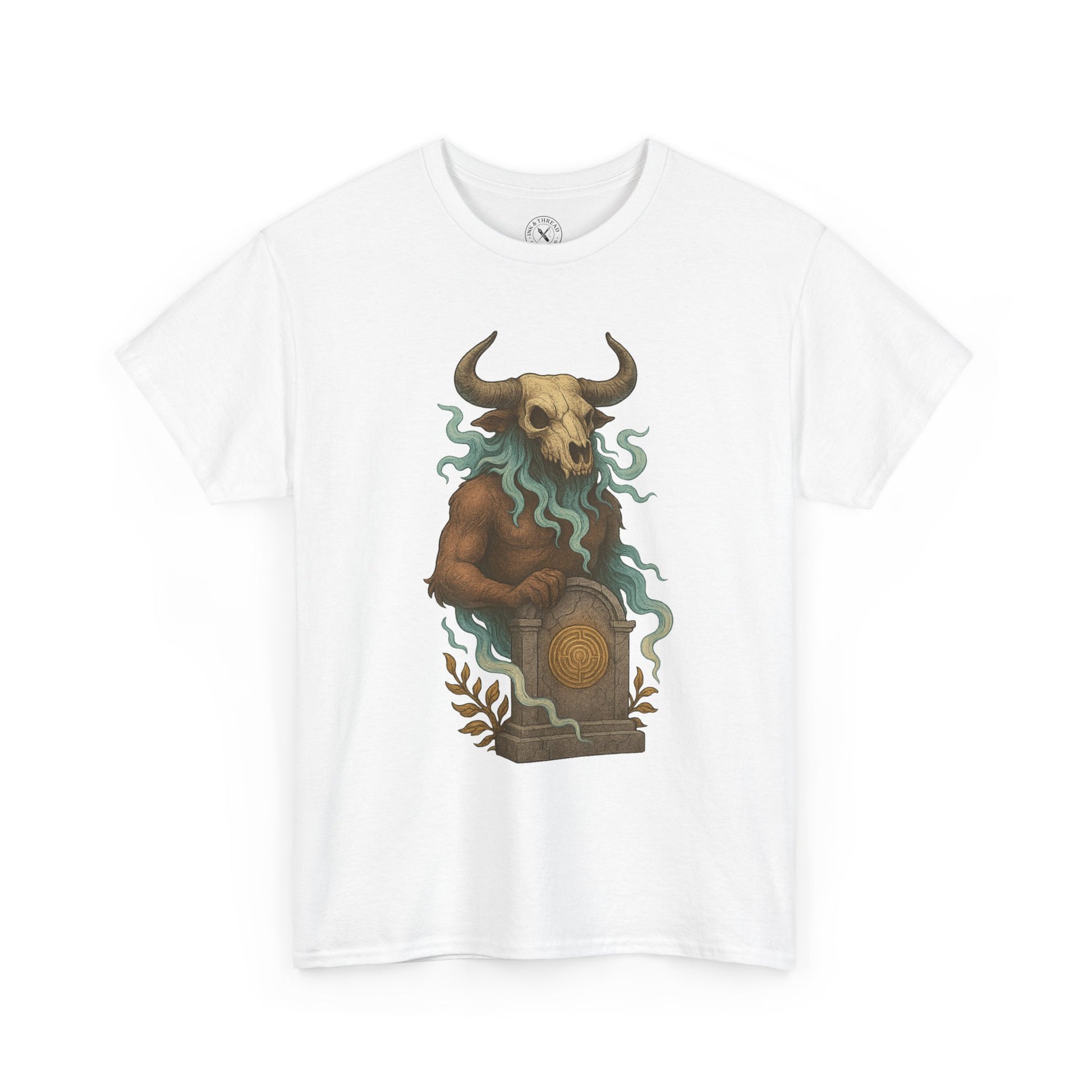 Beneath the ruins of the labyrinth lies Asterion, the Minotaur reborn in spirit and shadow. No longer the monster of Crete, he stands as a silent guardian over his own grave — a symbol of forgotten glory and the duality of beast and man. His skull bears the marks of time, his breath now a whisper of blue mist that curls around the stone labyrinth seal carved in gold.