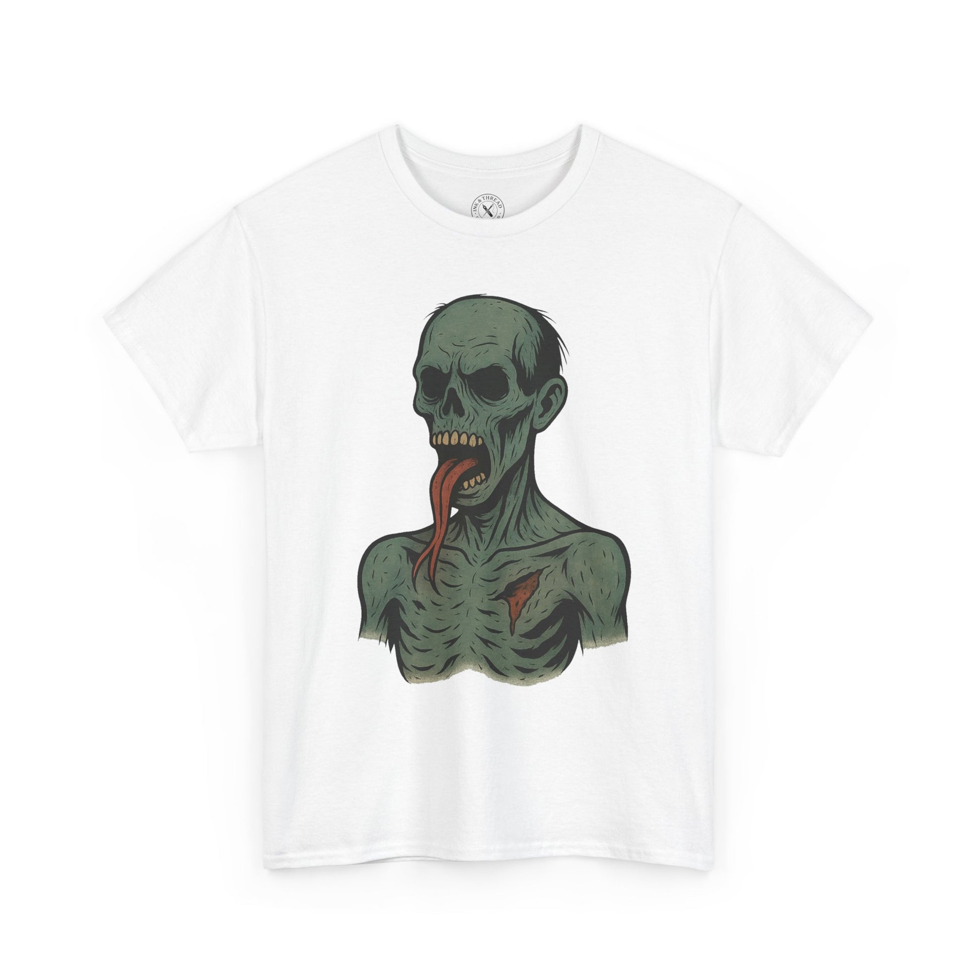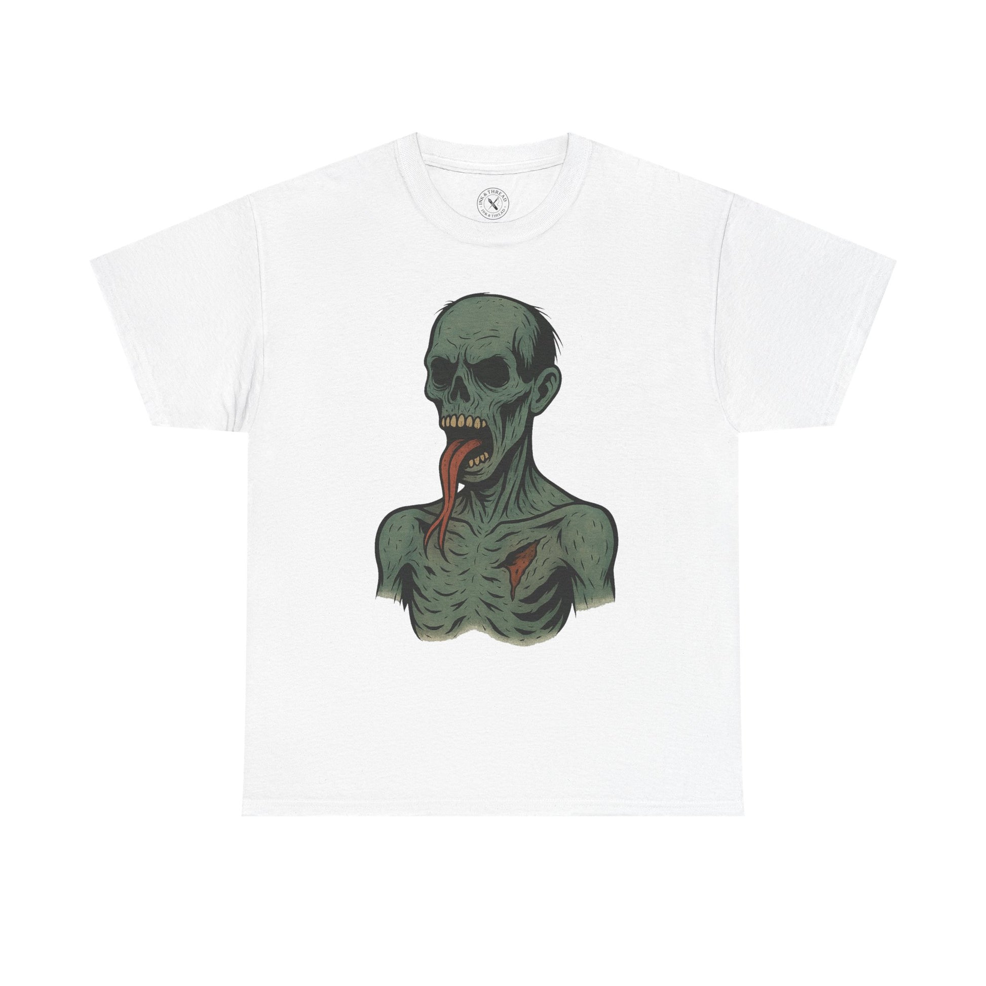 Rendered in the signature Ink & Thread pastel-ink style, Twin Tongue blends muted corpse greens, warm bone tones, and bold black linework for a crisp, print-perfect finish. The forked tongue becomes the defining feature — a creepy, venomous twist that sets this undead apart from the rest of the collection.