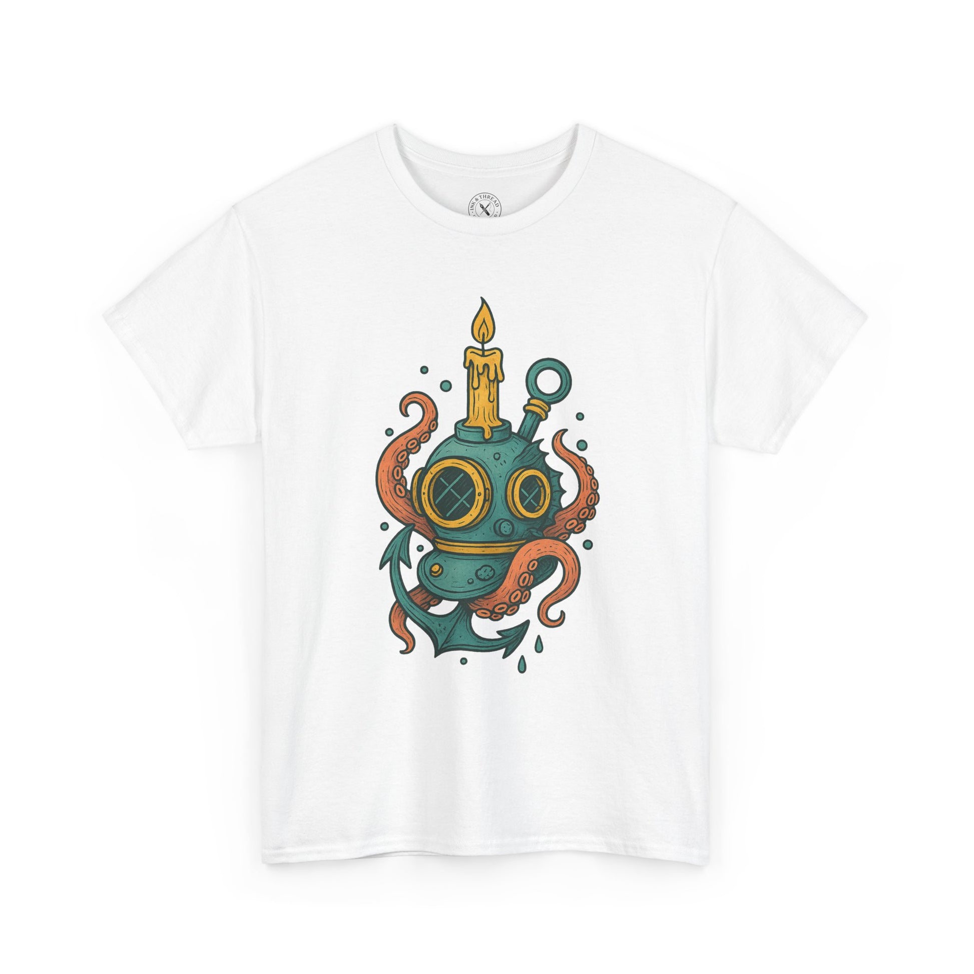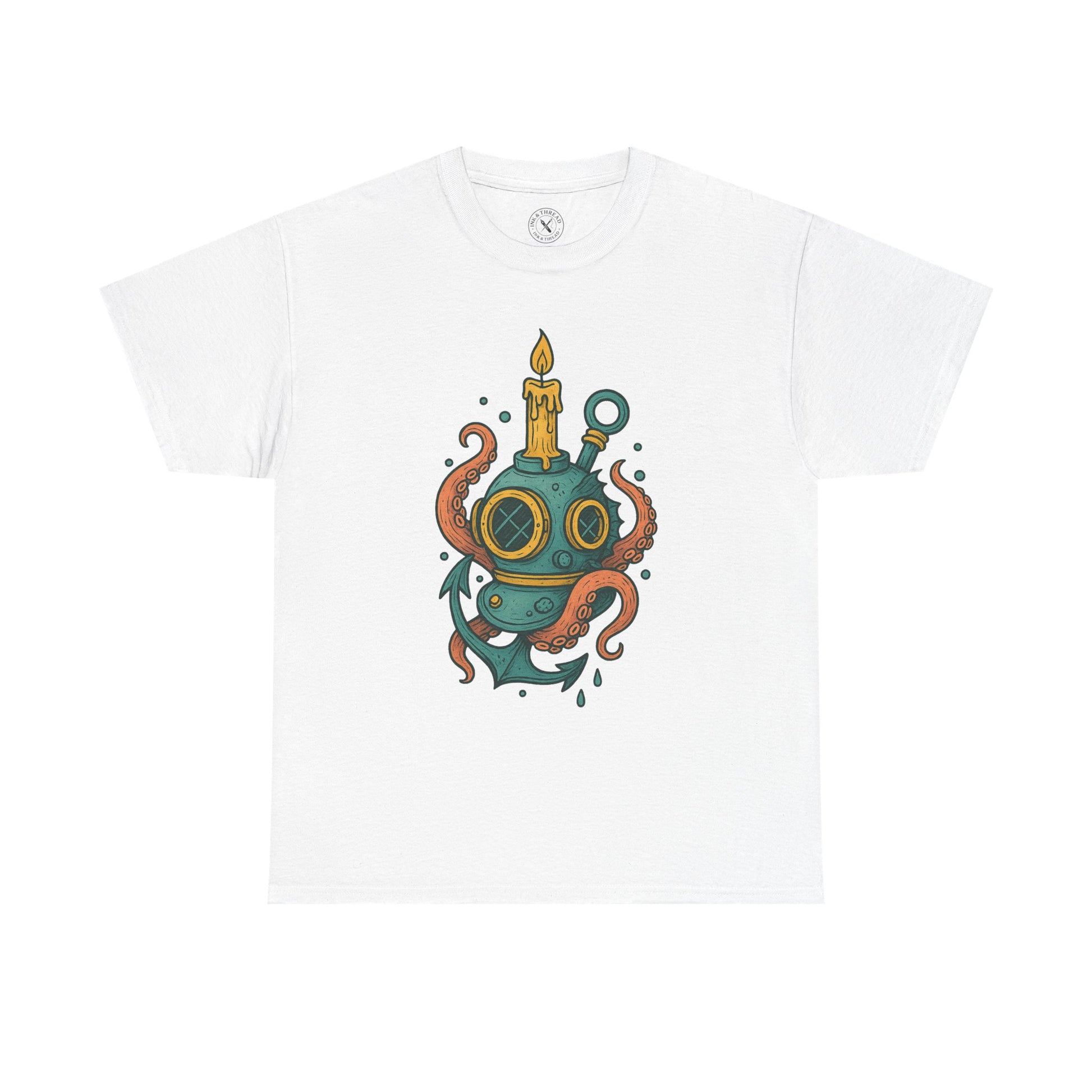Wrecklight channels the eerie glow of the ocean’s forgotten places. A vintage diving helmet acts as a candle holder, flickering flame atop while tentacles curl from the shadows within. Wrapped in bold lines and luminous pastels, this hand-drawn piece merges maritime mystery with tattoo tradition – a surreal emblem for ocean souls, wreck divers, and ink collectors.